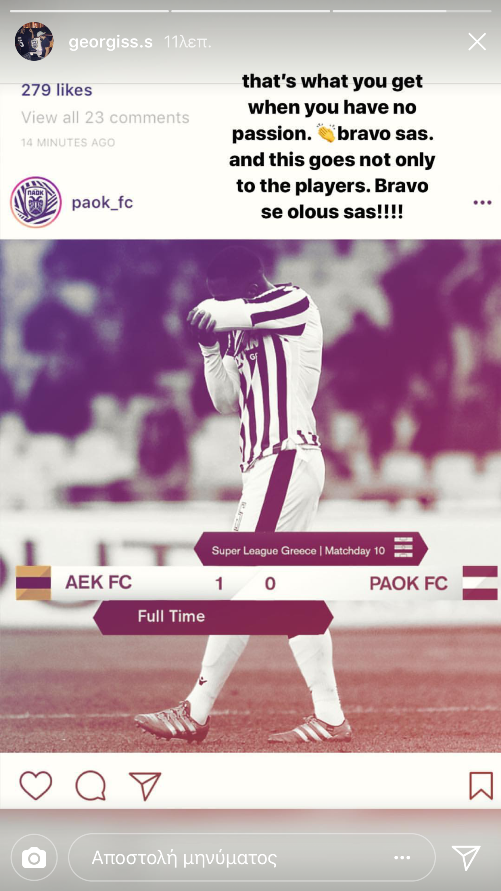 «Αυτά παθαίνεις όταν δεν έχεις πάθος. Μπράβο σας. Και αυτό δεν πάει μόνο στους παίκτες. Μπράβο σε όλους σας!!!» έγραψε χαρακτηριστικά στο Instagram με σαφή ειρωνική διάθεση.