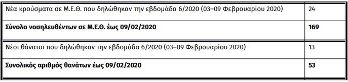 «Από 03 έως 09 Φεβρουαρίου 2020 καταγράφηκαν 187 σοβαρά κρούσματα εργαστηριακά επιβεβαιωμένης γρίπης. Από αυτά, τα 169 με νοσηλεία σε Μ.Ε.Θ.  Από το σύνολο των ασθενών αυτών, μόνο 70 (37,4%) είχαν εμβολιαστεί για τη γρίπη. Το ίδιο χρονικό διάστημα καταγράφηκαν συνολικά 53 θάνατοι από εργαστηριακά επιβεβαιωμένη γρίπη. Οι 39 θάνατοι αφορούσαν σε ασθενείς που νοσηλεύτηκαν σε Μ.Ε.Θ και 14 σε ασθενείς χωρίς νοσηλεία σε Μ.Ε.Θ.»