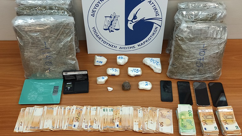 Σε έρευνα που πραγματοποιήθηκε στην μεζονέτα της Γλυφάδας, βρέθηκαν και κατασχέθηκαν κοκαΐνη βάρους 672 γραμμαρίων, ακατέργαστη κάνναβη (SKUNK) βάρους 6 κιλών και 565 γραμμαρίων, κατεργασμένη κάνναβη βάρους 37,5 γραμμαρίων, το χρηματικό ποσό των 29.800 ευρώ, 2 ζυγαριές ακριβείας, 4 συσκευές κινητής τηλεφωνίας και Ι.Χ.Ε. αυτοκίνητο.