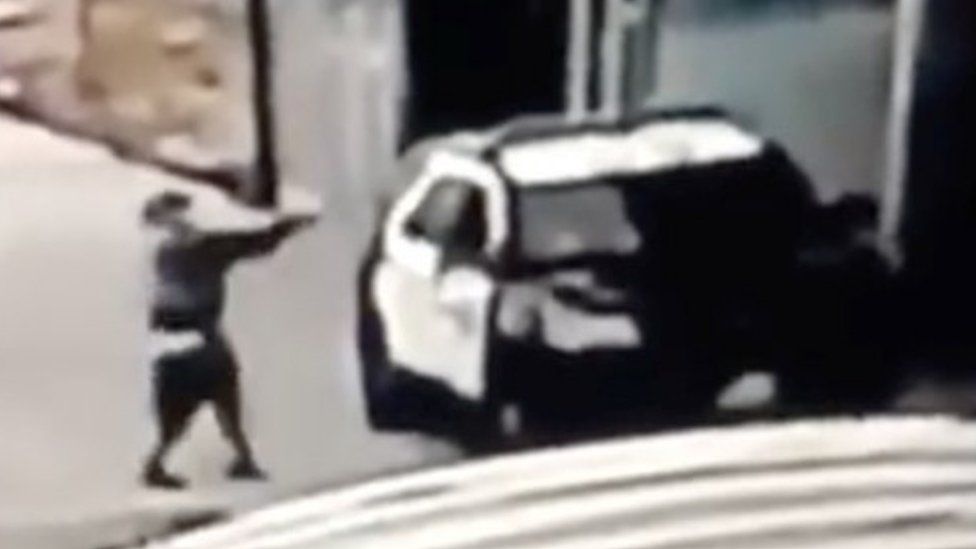 Πλάνα από το συμβάν που συνέβη στην πόλη Κόμπτιν και έδωσε στη δημοσιότητα το γραφείο του σερίφη δείχνουν τον ύποπτο δράστη να πλησιάζει πεζός το σταθμευμένο όχημα και να πυροβολεί από το παράθυρο του συνοδηγού του περιπολικού με ένα περίστροφο και μετά να τρέπεται σε φυγή.