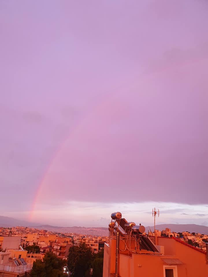 Η υψηλή συγκέντρωση σκόνης στα σύννεφα, καθώς και οι τελευταίες αχτίδες του ηλίου έφτιαξαν έναν μοναδικό «πίνακα» πάνω από την Αθήνα. Την ώρα που καταγράφηκε το φαινόμενο αυτό η βροχή είχε σταματήσει.