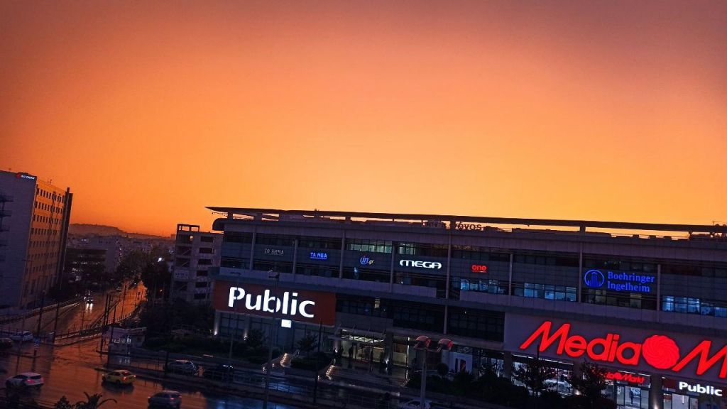 Με έντονο πορτοκαλί χρώμα βάφτηκε ο αττικός ουρανός το βράδυ της Δευτέρας την ώρα που έδυε ο ήλιος, καθώς η κακοκαιρία είχε ήδη χτυπήσει το μεγαλύτερο μέρος του λεκανοπεδίου.