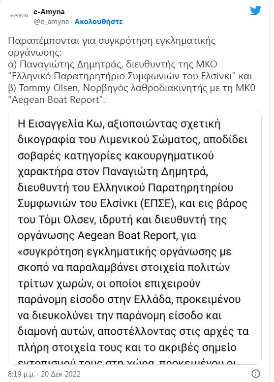Η Εισαγγελία Κω, αξιοποιώντας σχετική δικογραφία του Λιμενικού Σώματος, αποδίδει σοβαρές κατηγορίες κακουργηματικού χαρακτήρα στον Παναγιώτη Δημητρά, διευθυντή του Ελληνικού Παρατηρητηρίου Συμφωνιών του Ελσίνκι (ΕΠΣΕ), και εις βάρος του Τόμι Ολσεν, ιδρυτή και διευθυντή της οργάνωσης Aegean Boat Report, για «συγκρότηση εγκληματικής οργάνωσης με σκοπό να παραλαμβάνει στοιχεία πολιτών τρίτων χωρών, οι οποίοι επιχειρούν παράνομη είσοδο στην Ελλάδα, προκειμένου να διευκολύνει την παράνομη είσοδο και διαμονή αυτών, αποστέλλοντας στις αρχές τα πλήρη στοιχεία τους και το ακριβές σημείο εντοπισμού τους στη χώρα, προκειμένου οι τελευταίοι να υπαχθούν στις διαδικασίες ασύλου».