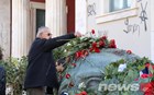 Πλήθος κόσμου καταθέτει στεφάνια και ένα λουλούδι.