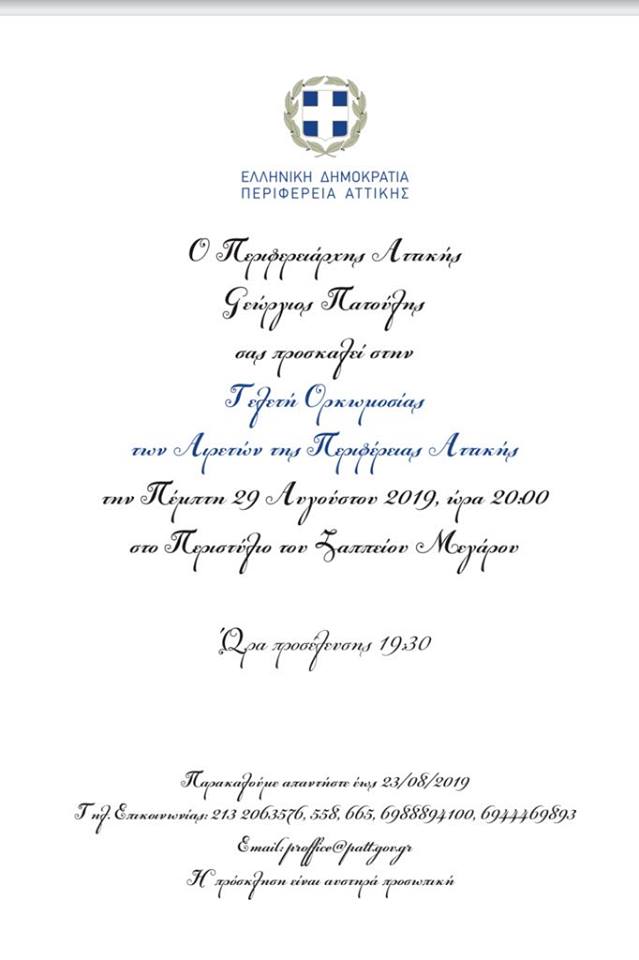 ΕΛΛΑΔΑ Στις 29 /8 η ορκωμοσία του νέου περιφερειάρχη Αττικής, Γ. Πατούλη Από john - 22 Αυγούστου 2019 0 256 FacebookTwitterPinterestWhatsApp Το βράδυ της Πέμπτης, 29 Αυγούστου, στο Περιστύλιο του Ζαππείου Μεγάρου θα πραγματοποιηθεί η τελετή ορκωμοσίας του νέου περιφερειάρχη Αττικής, Γιώργου Πατούλη, και των μελών του νέου Περιφερειακού Συμβουλίου.