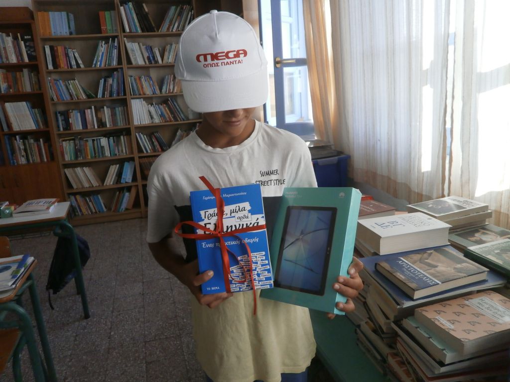 Σχολικές τσάντες, που εκτός από το πολυπόθητο τάμπλετ -που ο Μιχαήλ-Άγγελος ήλπιζε μήνες να βρεθεί κάποιος να του χαρίσει ένα-, περιείχαν και άλλα πολύτιμα δώρα που καλύπτουν κρίσιμες ανάγκες τους, δέματα με περισσότερα από εκατό βιβλία για τη βιβλιοθήκη του σχολείου, αλλά και μαρκαδόρους, ξυλομπογιές, μπλοκ για ζωγραφική, μολύβια, στιλό, τετράδια, υλικά για χειροτεχνίες, καθώς και μελάνια για τον εκτυπωτή.