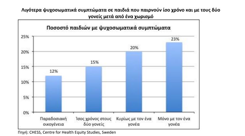 Μελέτη σε 150.000 παιδιά ηλικίας 12-15 ετών δείχνει ότι παιδιά που παιρνούν ίσο χρόνο και με τους δύο γονείς μετά από έναν χωρισμό έχουν λιγότερα ψυχοχωματικά συμπτώματα σε σχέση με παιδιά που ζουν κυρίως ή μόνο με τον ένα γονέα.