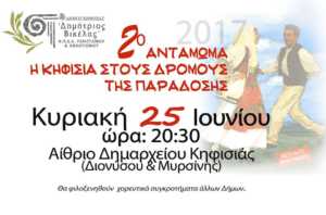 Το 2ο Αντάμωμα ¨Κηφισιά στους δρόμους της παράδοσης” του Δήμου Κηφισιάς, το οποίο διοργανώνει ο Οργανισμός Πολιτισμού & Αθλητισμού «Δημήτριος Βικέλας», θα πραγματοποιηθεί την Κυριακή 25 Ιουνίου 2017, στις 20:30, στο αίθριο του δημαρχείου Κηφισιάς (Διονύσου & Μυρσίνης).