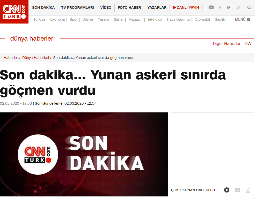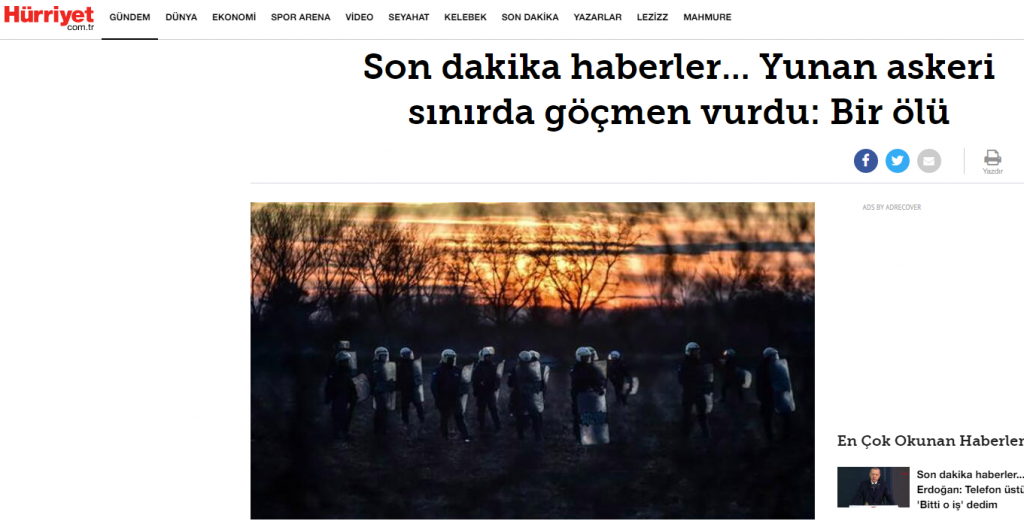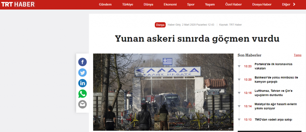 Σύμφωνα λοιπόν με όσα αναφέρει το TRT Haber και αναδημοσιεύουν όλα τα τουρκικά ΜΜΕ, «ο μετανάστης πυροβολήθηκε στην πλάτη από έλληνα στρατιώτη και έπεσε νεκρός».