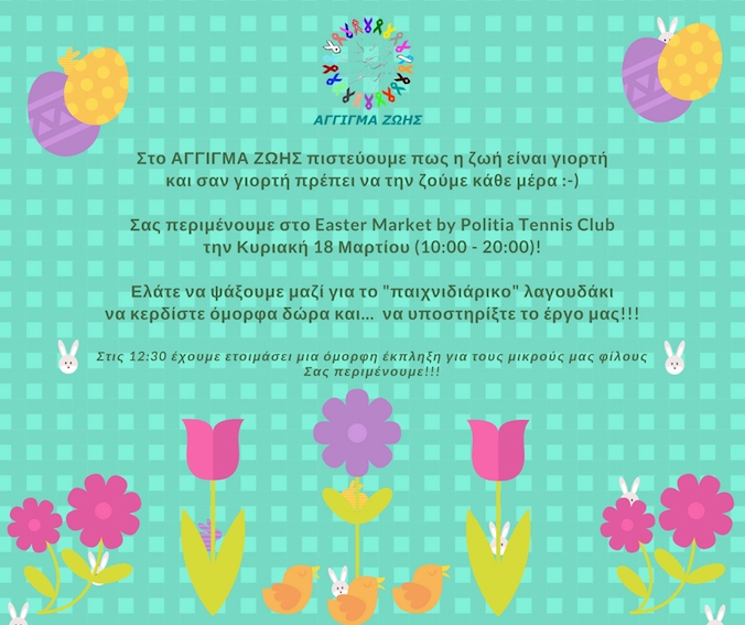 ΤΟΠΙΚΑ Το Άγγιγμα Ζωής σας προσκαλεί στο Πασχαλινό του bazaar. Κυριακή 18 Μαρτίου. Από john - 15 Μαρτίου 2018 0 225 FacebookTwitterPinterestWhatsApp