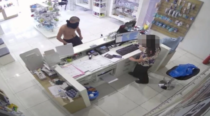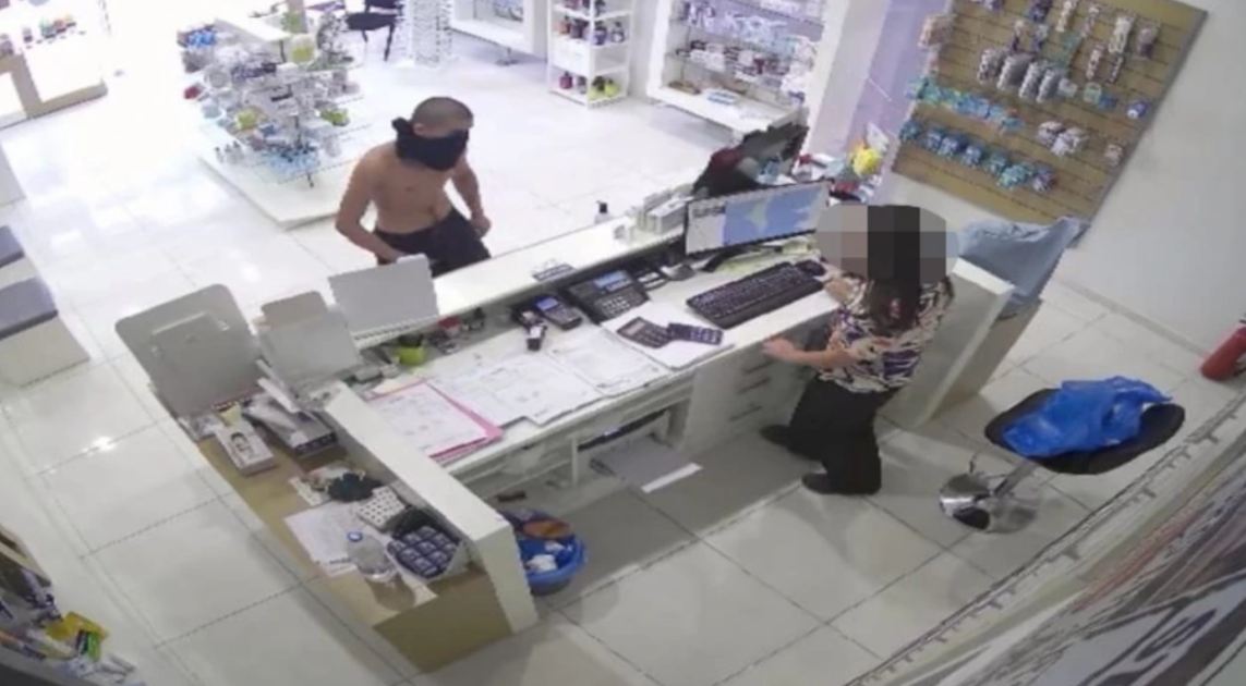 Στη φωτογραφία από το κλειστό κύκλωμα του φαρμακείου που δημοσιεύει το protothema.gr διακρίνεται ο νεαρός ληστής να κρατά το μαχαίρι με το δεξί του χέρι και να απειλεί τη φαρμακοποιό για να του δώσει την είσπραξη.