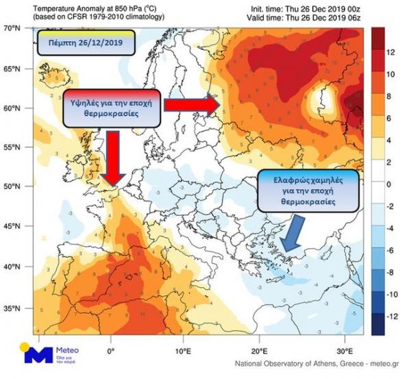 Οι θερμοκρασίες που επικρατούν στη χώρα μας κυμαίνονται σε ελαφρώς χαμηλότερα από τα κανονικά για την εποχή επίπεδα (της τάξης των 1-3 βαθμών), όπως φαίνεται στον ακόλουθο χάρτη όπου απεικονίζεται η διαφορά των θερμοκρασιών των αερίων μαζών που επικρατούν στην Ευρώπη, σε σχέση με τις κανονικές (κλιματικές) για την εποχή θερμοκρασίες, την Πέμπτη.