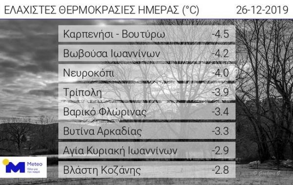 Χαμηλές θερμοκρασίες και κατά τόπους παγετός σημειώθηκαν τις πρωινές ώρες της Πέμπτης στα ηπειρωτικά κυρίως τμήματα της χώρας, χωρίς όμως αυτές οι θερμοκρασίες να σχετίζονται με την επερχόμενη κακοκαιρία Ζηνοβία.