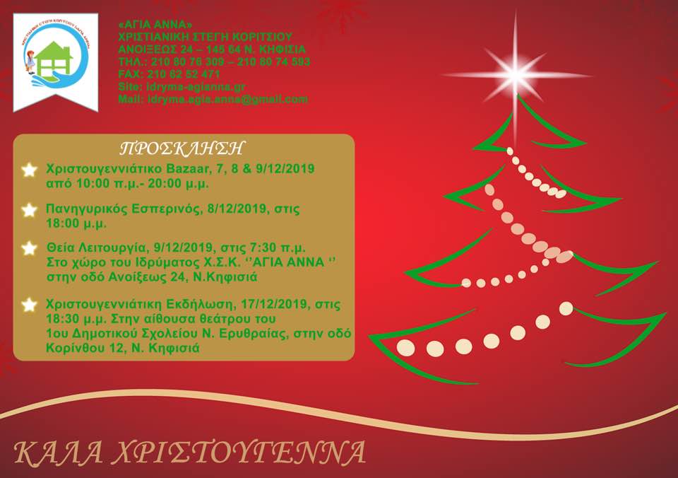 Τη Δευτέρα 9 Δεκεμβρίου πανηγυρίζει ο Ιερός Ναός Αγ. Άννας στο ομώνυμο ίδρυμα “ΧΡΙΣΤΙΑΝΙΚΗ ΣΤΕΓΗ ΚΟΡΙΤΣΙΟΥ” , κατά το ακόλουθο πρόγραμμα.