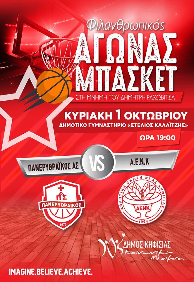 Ένας ξεχωριστός φιλανθρωπικός αγώνας μπάσκετ θα διεξαχθεί αυτή την Κυριακή 01/10, ώρα 19.00, στο κλειστό γήπεδο “Στέλιος Καλαϊτζής” ανάμεσα στον Πανερυθραϊκό μας και την Αθλητική Ένωση Νέας Κηφισιάς για την ενίσχυση του Κοινωνικού Παντοπωλείου του Δήμου Κηφισιάς και των οικογενειών που χρειάζονται την βοήθειά μας.