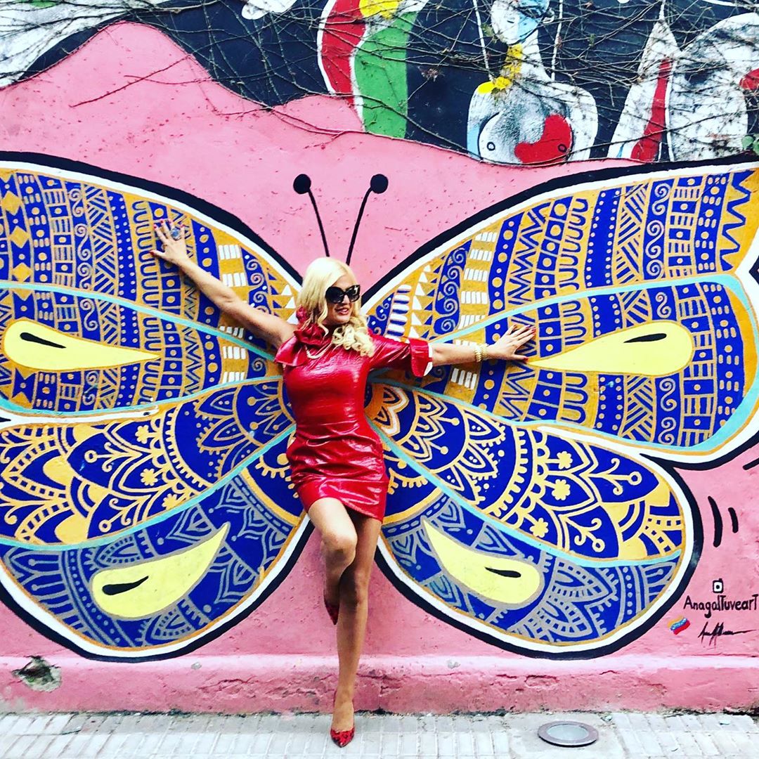 Η Μαρίνα Πατούλη έκανε δυο εμφανίσεις με κόκκινο vinul! H μία ήταν με ένα σέξι κόκκινο μίνι φόρεμα και κόκκινες γόβες. Πόζαρε μάλιστα σε ένα ζωγραφισμένο τοίχο της πόλης με μια τεράστια πεταλούδα!