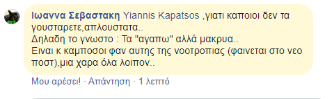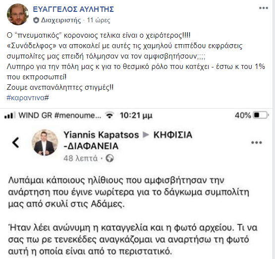 Η δεύτερη ανάρτηση συγκέντρωσε και αυτή μεγάλο αριθμό σχολίων, 107 συγκεκριμένα. Και εκεί που η κατάσταση πήγαινε προς αποκλιμάκωση ο αντιδήμαρχος Βαγγέλης Αυλήτης έκανε και εκείνος μια ανάρτηση κατηγορώντας το Γ. Καπάτσο για απρεπής χαρακτηρισμούς λέγοντας μάλιστα ότι έχει πνευματικό κορονοιό !