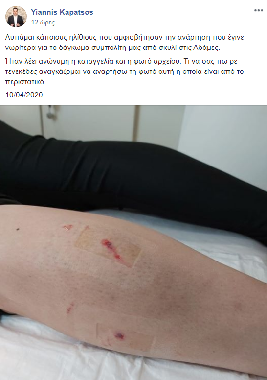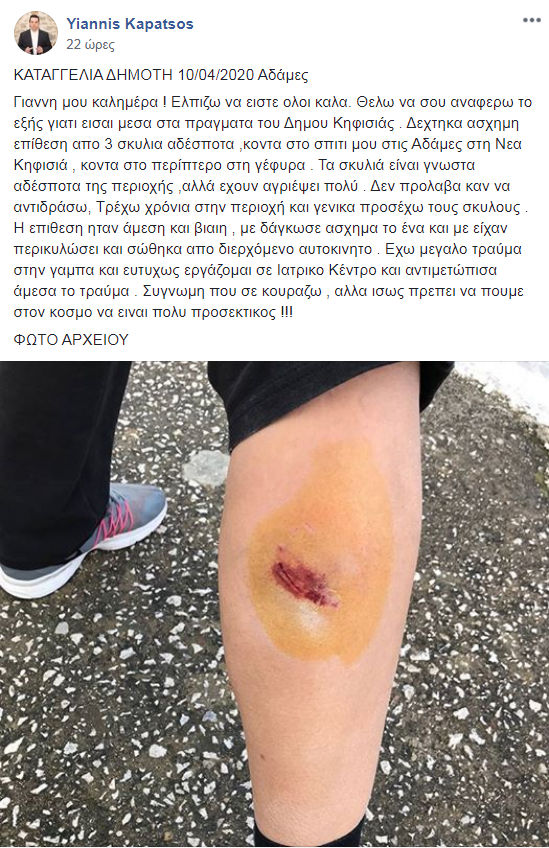 Στις 11.30 ο κος Καπάτσος ανέβασε μια φωτογραφία και ένα μήνυμα από κάποια δημότισσα η οποία είχε δεχτεί επίθεση από αγέλη αδέσποτων κοντά στο περίπτερο στην περιοχή των Αδαμών στην Κηφισιά. Η παθούσα κατήγγειλε ότι δέχτηκε βίαιη επίθεση και πως είχε δάγκωμα στο αριστερό της πόδι. Σώθηκε από διερχόμενο οδηγό ο οποίος τη βοήθησε, σύμφωνα πάντα με τη μαρτυρία της να απεγκλωβιστεί.