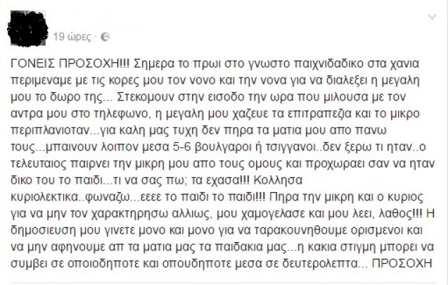 Σύμφωνα με την ίδια η απόπειρα έγινε από 5-6 άτομα που πιθανόν να ήταν Βούλγαροι ή τσιγγάνοι, ένας εκ των οποίων, με απίστευτο θράσος πήρε το μικρό κορίτσι που εκείνη την ώρα κοίταζε τα παιχνίδια και προσπάθησε να φύγει σα να μη συνέβη τίποτα!