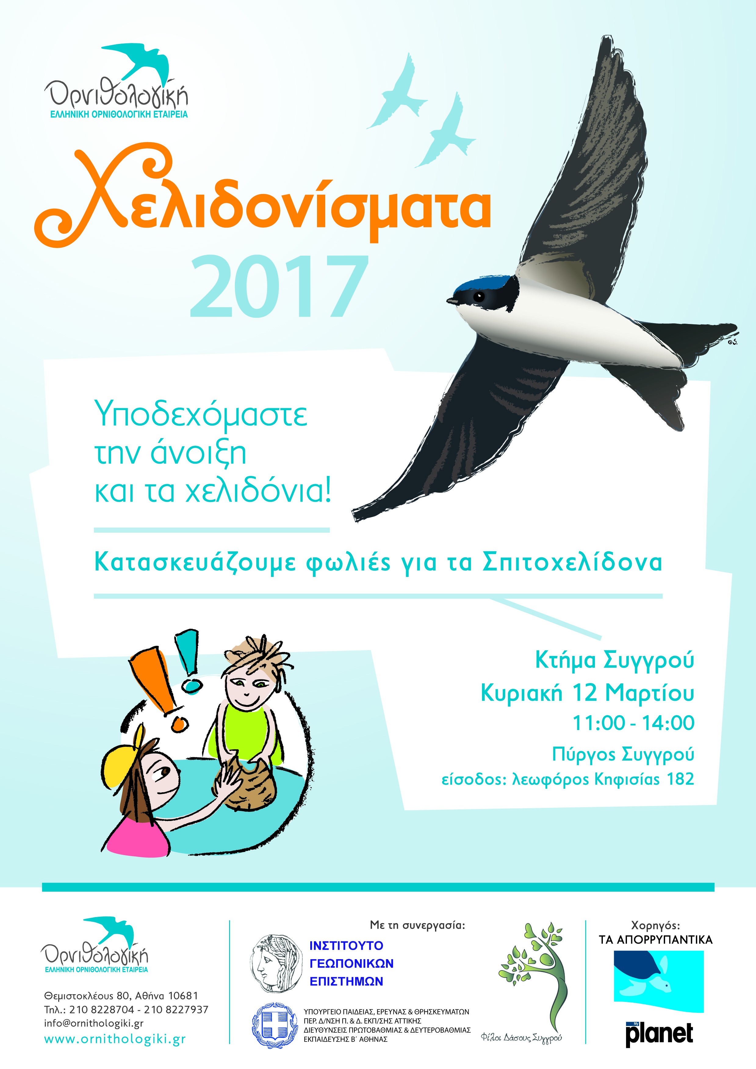 Η εκδήλωση υλοποιείται από την Ελληνική Ορνιθολογική Εταιρεία με τη συνεργασία του Ινστιτούτου Γεωπονικών Επιστημών και των «Φίλων του Δάσους Συγγρού», με τη χορηγία των απορρυπαντικών Planet.
