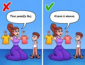 Πρώτα απ ‘όλα, τα παιδιά προτιμούν τις επιλογές και τον έλεγχο, οπότε, για παράδειγμα, όταν βγαίνετε, ρωτήστε ποια μπλούζα θέλουν να φορέσουν. Αλλά να είστε πιο συγκεκριμένοι με την ερώτησή σας. Αντί της “Ποιο;” είναι καλύτερα να ρωτήσετε, “Κίτρινο ή κόκκινο;”