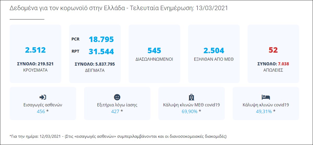 Σήμερα, Σάββατο 13 Μαρτίου, ο Εθνικός Οργανισμός Δημόσιας Υγείας ανακοίνωσε 2.512 νέα κρούσματα Covid-19 στην Ελλάδα, αριθμός μεγαλύτερος από τα 2.405 κρούσματα που καταγράφηκαν την προηγούμενη ημέρα.