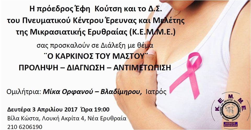 ΤΟΠΙΚΑ 3 Απριλίου διάλεξη Ο Καρκίνος του Μαστού στη Βίλα Κώστα. Από john - 3 Απριλίου 2017 0 250 FacebookTwitterPinterestWhatsApp
