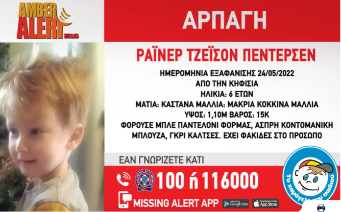Συναγερμός έχει σημάνει για τον 6χρονο Ράινερ Τζέισον, που εξαφανίστηκε χθες 24/5 από την Κηφισιά. «Το Χαμόγελο του Παιδιού» έχει βγάλει Amber Alert κάνοντας λόγο για αρπαγή.