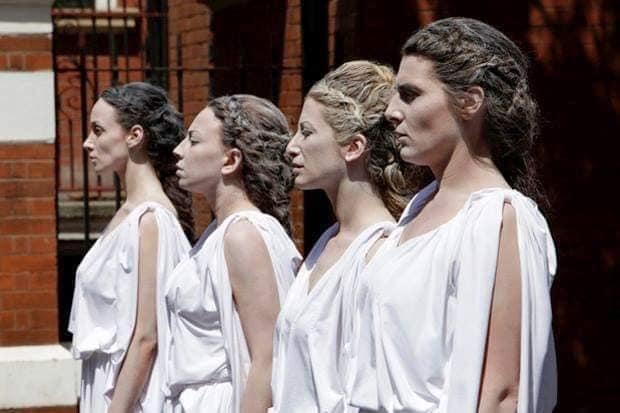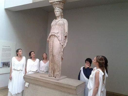 από έξι σύγχρονες Ελληνίδες Καρυάτιδες, ντυμένες με αρχαιοελληνικά φορέματα, μπήκαν στο Βρετανικό Μουσείο για να συναντήσουν την αρπαγμένη από τον Λόρδο Έλγιν Καρυάτιδα του Ερεχθείου της Ακρόπολης των Αθηνών.