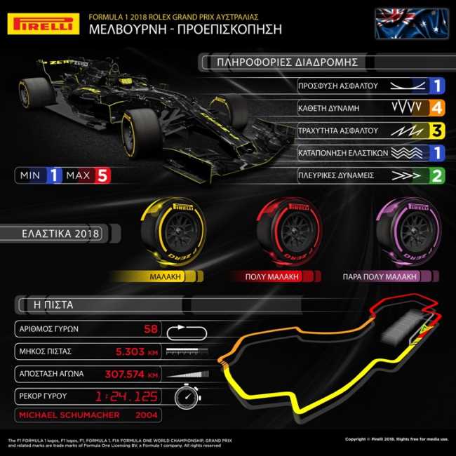 Η επιλογή γομών για το Αυστραλιανό Grand Prix είναι ίδια με την περσινή – μαλακή, πολύ μαλακή, πάρα πολύ μαλακή – όλες οι γόμες είναι ένα επίπεδο πιο μαλακές από τις αντίστοιχες περσινές. Οι φετινές πιο μαλακές γόμες έπαιξαν ρόλο και στη μεγάλη βελτίωση απόδοσης που καταγράφηκε στις δοκιμές εξέλιξης. Με νέα μονοθέσια, νέους οδηγούς, ευμετάβλητο καιρό και σημαντική βελτίωση στο κράτημα της πίστας κατά τη διάρκεια του τριημέρου, η Μελβούρνη είναι παραδοσιακά ένας από τους πιο απρόβλεπτους αγώνες της χρονιάς, που όλοι αδημονούν να γίνει.