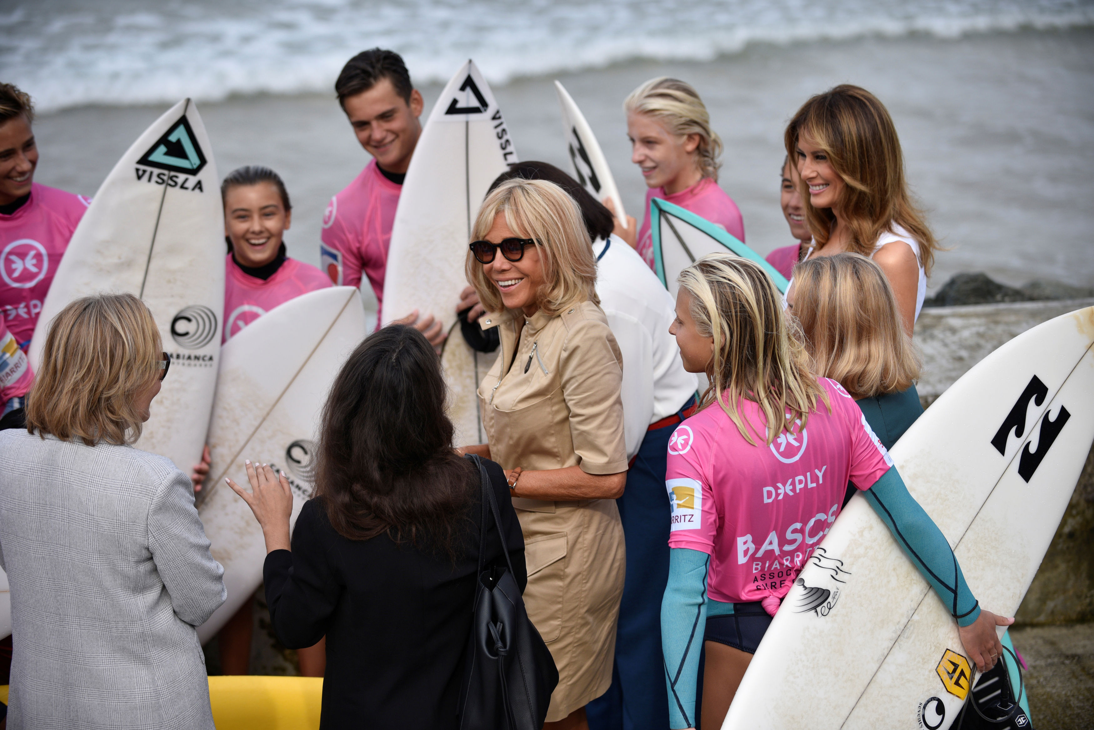 Η πρώτη κυρία της Γαλλίας, η Μελάνια Τραμπ, η Άκιε Άμπε (σύζυγος του Ιάπωνα πρωθυπουργού Σίνζο Άμπε) η Σεσίλια Μορέλ (σύζυγος του προέδρου της Χιλής Σεμπαστιάν Πινιέρα) η Τζένι Μόρισον (σύζυγος του Αυστραλού πρωθυπουργού Σκοτ Μόρισον) καθώς και οι σύζυγοι του Ντόναλντ Τουσκ, του προέδρου του Ευρωπαϊκού Συμβουλίου και του Ντέιβιντ Μάλπας, προέδρου της Παγκόσμιας Τράπεζας, συναντήθηκαν με δύο πρωταθλητές του σερφ.