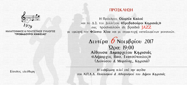 Ο Πολιτιστικός Σύλλογος «Τροβαδούροι Κηφισιάς» διοργανώνει βραδιά JAZZ, τη Δευτέρα 6 Νοεμβρίου 2017 και ώρα: 19:00 στην Αίθουσα Δημαρχείου Κηφισιάς «Δήμαρχος Βασ. Γκατσόπουλος» (Διονύσου & Μυρσίνης), με ομιλητή τον Φίλιππο Χίου και με τη συμμετοχή καταξιωμένων μουσικών.