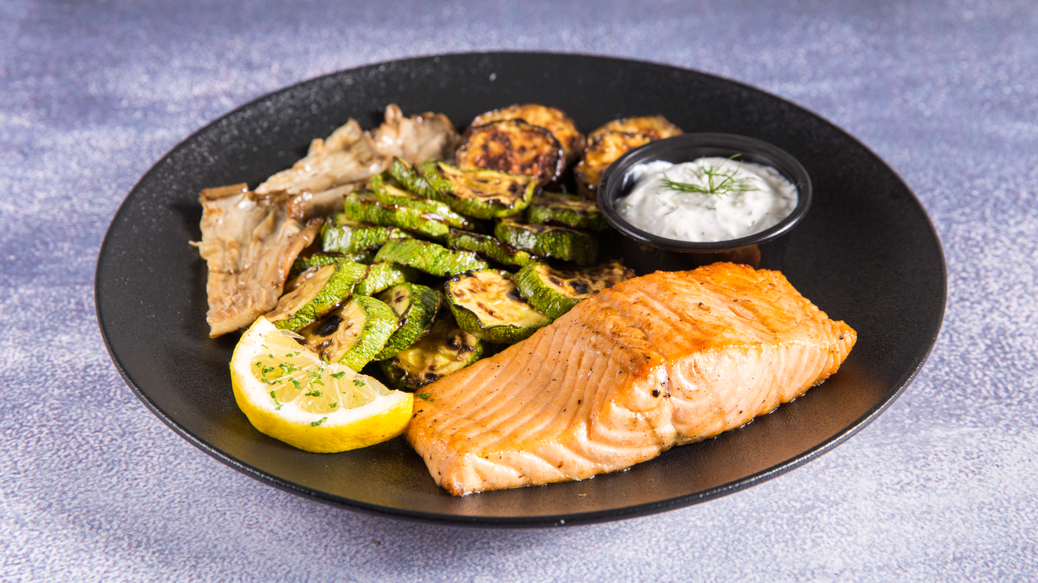 το φιλέτο σολομού στα κάρβουνα με την δροσερή σως γιαουρτιού