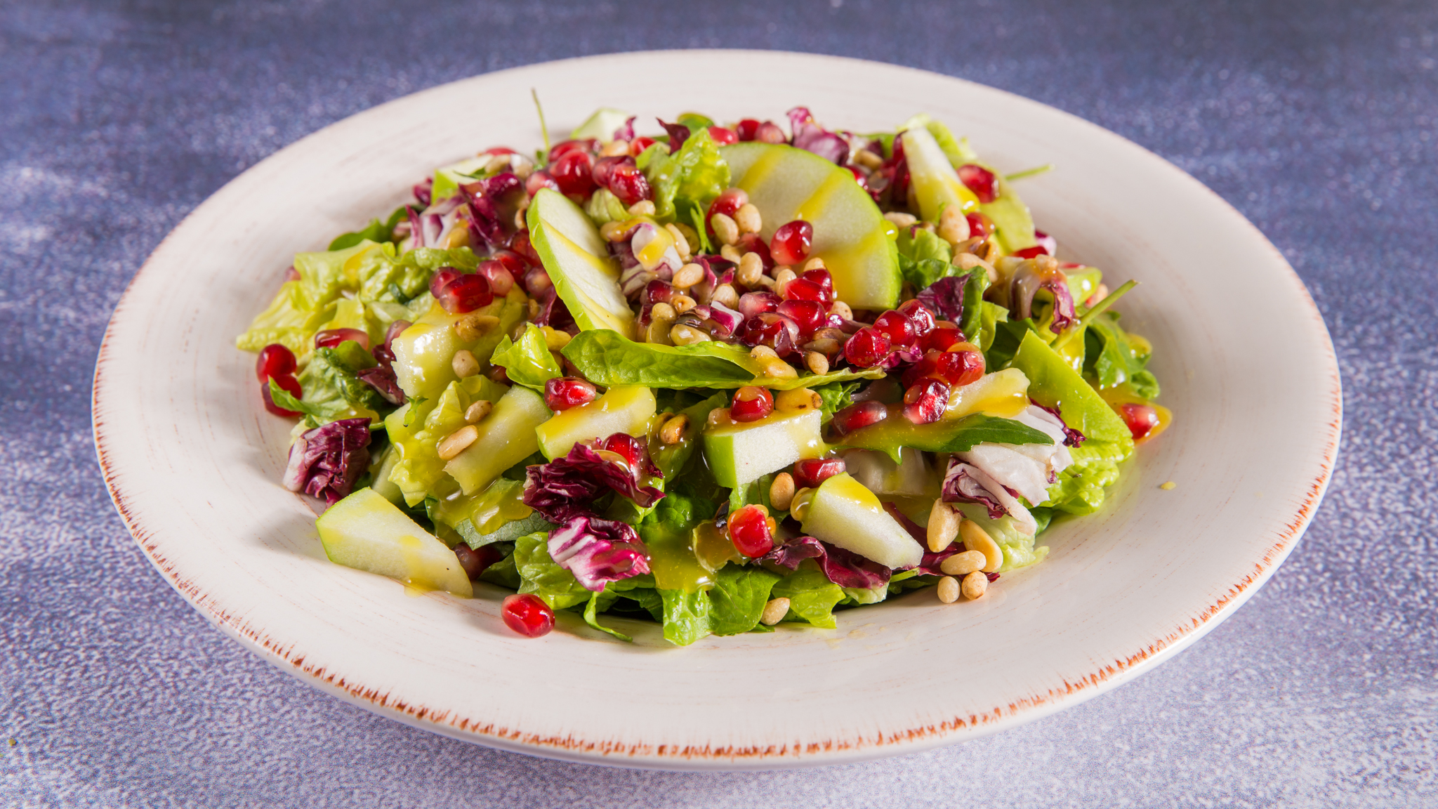 τις ολόφρεσκες δροσερές σαλάτες, όπως την Γαλλική με ρόδι, πράσινο μήλο και γλυκιά σως μηλόξυδου
