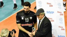 Ο κεντρικός του ΠΑΟΚ Γιάννης Τακουρίδης πριν από τον επαναληπτικό ημιτελικό του Λιγκ Καπ Νίκος Σαμαράς με αντίπαλο τον Ολυμπιακό στο PAOK Sports Arena βραβεύτηκε για την ανάδειξη του ως MVP Bίκος Cola της 4ης αγωνιστικής.
