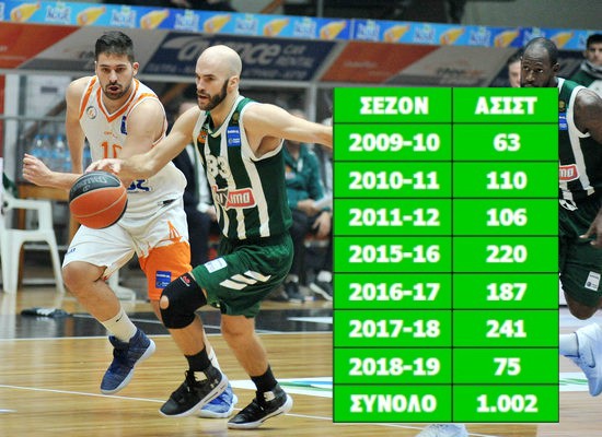 Ο Καλάθης χρειάστηκε 216 αγώνες για να ξεπεράσει τις 1.000 ασίστ και έγινε ο 6ος παίκτης στην ιστορία του επαγγελματικού Πρωταθλήματος που φτάνει σε αυτόν τον αριθμό.