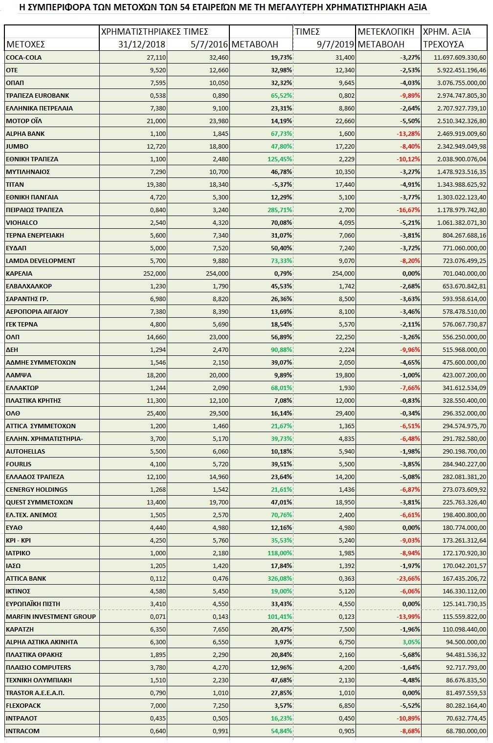 Από την αρχή της εφετινής χρονιάς και μέχρι τις 5 Ιουλίου (παραμονές των εκλογών) το χρηματιστήριο ενισχύθηκε κατά 45,9% με όρους Γενικού Δείκτη. Η αγοραία αξία όλων των εισηγμένων εταιρειών, αυξήθηκε από τα 43,287 δις στα 59,639 δις , για να υποχωρήσει κατά 3,149 δις ευρώ στις δύο τελευταίες συνεδριάσεις. Οι τράπεζες που είχαν πρωτοστατήσει στο ράλι ήταν εκείνες που δέχθηκαν τις μεγαλύτερες πιέσεις μετεκλογικά.